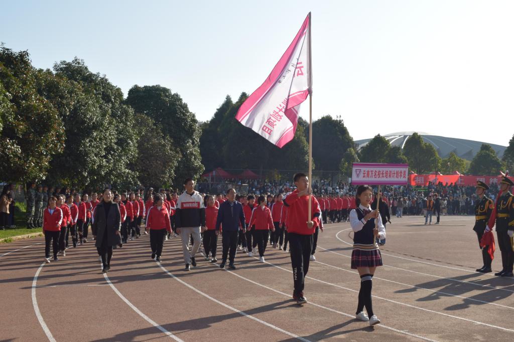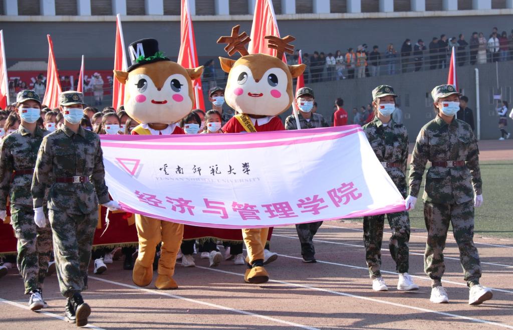 伴随着慷慨激昂的《运动员进行曲》,英姿飒爽的国旗队、青春靓丽的鲜花队、热情洋溢的红旗队三个特色方阵拉开了体育节方阵序幕。23个方阵队伍依次通过主席台。外国语学院方阵中出现了四个卡通人偶,一入场就吸引了观众的眼球;“信息信息、披荆斩棘,发奋图强、共创辉煌!”信息学院师生喊着响亮的口号阔步前行;“壮志凌云、文院风采,心怀鸿鹄、不负韶华”,文学院师生以整齐的步伐展示着必胜的信心;“学高身正、明德睿智,尊师崇真、敦品励志,音为有你、舞比温暖,团结拼搏、再创佳绩”音乐舞蹈学院学子步伐矫健,口号嘹亮;“华文国语,中外一家,赛场逐梦,振兴中华”富有特色的口号展示着云南华文学院学子锐意进取的朝气;地理学部学子怀抱地球仪,手持导游旗,肩扛测绘仪,矫健的脚步中洋溢着他们的青春活力;“向美而行,美美与共”,美术学院师生举着富有艺术感的设计图案,诠释着对真理和美的追求;能环学院方阵中出现了卡通人偶——可爱的“太阳宝宝”,师生们以自己的方式展现了学院团结、拼搏、向上的风貌;“传播风尚,构筑和谐,以心为媒,沟通天下”,在坚定的口号声中,传媒学院方阵尽显奋进者、开拓者、奉献者的青春力量;胸怀“教育家梦想”的云南省“万名校长培训计划项目”学员代表队别具特色,以沉稳的步伐展现着他们超越自我,勇争一流,迎接云南基础教育美好未来的自信。别样的风采,高昂的斗志,各方阵以不同的形式展现各自的特色和激情,现场观众喝彩阵阵。