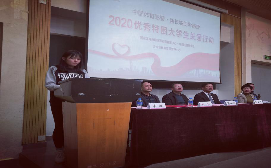 仪式上,蔡金红副校长、体育学院党委书记朱黎,云南省体育彩票管理中心主任张云龙向同学们授予“中国体育彩票·新长城助学基金”资助牌,并勉励同学们努力学习、刻苦钻研、学有所成。
