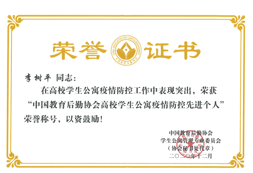 2020年12月13日,中国教育后勤协会学生公寓管理专业委员会常委会议暨疫情防控先进集体个人表彰大会在广西桂林召开。kaiyun官网后勤保障服务中心公寓管理科李树平同志被授予“中国教育后勤协会高校学生公寓疫情防控工作先进个人”荣誉称号,为云南省高校受表彰的3名公寓管理工作者之一。
