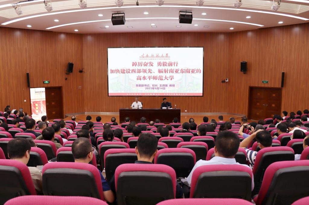 王德强强调,新学期要以立德树人为根本,以学科建设为引领,以改革创新为动力,坚持问题导向、坚持目标导向、坚持深化改革,把开展主题教育与落实年度重点工作任务紧密结合起来,以《kaiyuncom官方网站教育高质量发展三年行动实施方案(2023-2025)》为抓手,推动学校第十三次党代会目标任务落地,推进西部领先、辐射南亚东南亚的高水平师范大学建设。一是全面加强党的建设,引领高水平师范大学建设;二是以升学率提高5%为目标,持续提升人才培养质量;三是大力开展服务云南基础教育强师兴校行动,进一步彰显教师教育本色;四是以新增博士点数实现新跨越为目标,带动学科建设上新台阶;五是聚焦基础研究与社会产业发展,不断提升科研创新能力;六是加强师资队伍建设,打造高质量人才队伍;七是持续推进开放办学,进一步增强面向南亚东南亚的科教辐射能力;八是主动作为,不断拓展提升服务社会能力;九是提质增效,不断提升治理体系和治理能力现代化水平。