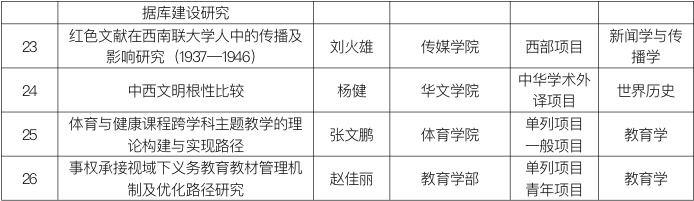 近日,全国哲学社会科学工作办公室公布了2023年国家社科基金年度项目、青年项目、西部项目、单列学科项目、中华学术外译项目的立项公示名单。kaiyun官网共有1个重点项目、16个一般项目、1个青年项目和5个西部项目进入公示;2个单列学科项目和1个中华学术外译项目获得立项,共计获得各类国家社科基金项目立项26项。从立项类别上看,kaiyun官网今年在单列项目和专项项目上均取得较好成绩。