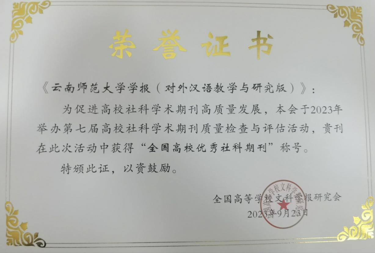 在全国高等学校文科学报研究会举办的第七届高校社科学术期刊质量检查与评估活动中,《kaiyuncom官方网站学报》(对外汉语教学与研究版)被评为“全国高校优秀社科期刊”。