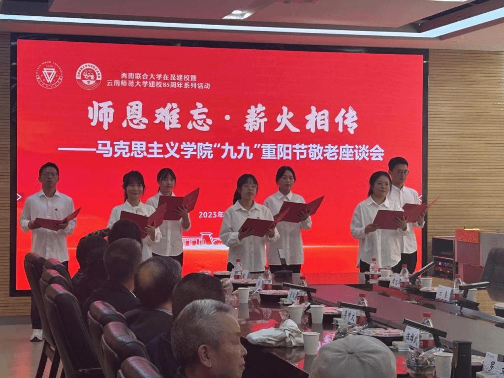 10月23日,在西南联大在昆建校暨kaiyuncom官方网站建校85周年来临之际,马克思主义学院举行“师恩难忘·薪火相传”九九重阳节敬老座谈会。校党委副书记李宏及学校相关部门领导,马克思主义学院学院部分退休教师、党政领导班子成员、师生代表参加座谈。