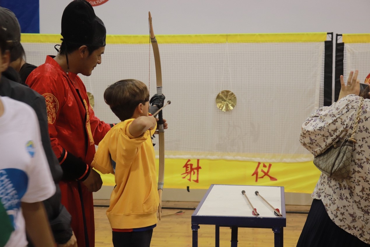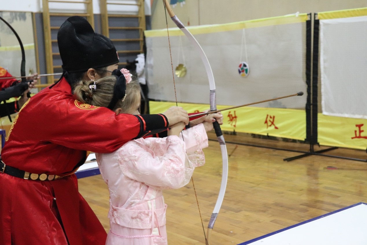 “嘭,嘭,嘭”,箭击中铜锣的声音回响在场地上空,帅气的射箭姿势深深吸引了在场的外国友人。他们纷纷聚集在射艺场地前,在教练的指导下,左手戴上手套和护腕,将箭尾处的凹槽插入箭弦,左手持弓右手拉弦,伸直左手大拇指,将箭放置在虎口处稳定,目光坚定,右手放开箭矢,“嘭”射中了铜锣,引得围观的人发出阵阵喝彩与惊叹。