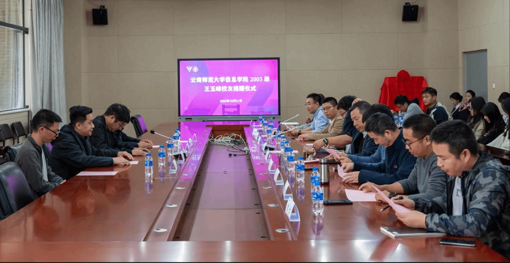 2003级校友代表、昆明麦岚企业管理有限公司董事长王玉峰及副总经理张寅;kaiyun官网副校长甘健侯,校友工作办公室副主任、教育基金会理事长谢锋,信息学院领导班子成员、师生代表参加捐赠仪式。