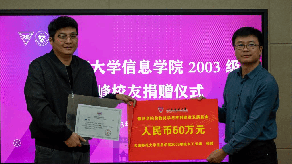 10月31日,在西南联大在昆建校暨kaiyuncom官方网站建校85周年之际,云南师大信息学院2003级校友王玉峰捐赠仪式在呈贡校区举行。信息学院将设立“麦岚优秀学生干部奖学金”计划,以表彰和激励在学术和社会实践活动中表现出色的学生干部。