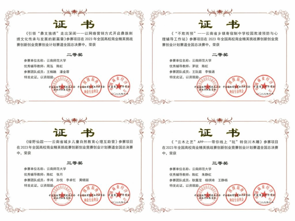 在10月21日的创业计划赛道(创客组)的决赛中,教育学部研究生组《“不欺而预”——云南省乡镇寄宿制中学校园欺凌预防与心理辅导工作站》(指导教师:茅锐、陈虹)和《引领“彝支独绣”走出深闺——以网络营销方式开启彝族刺绣文化传承与发展的新篇章》(指导教师:周泓、陈虹)获全国二等奖,研究生组《绿野仙踪——云南省城乡儿童自然教育心理互助营》(指导教师:陈虹、张月)和本科组《“云木之艺”APP——带你线上“玩”转剑川木雕》(指导教师:陈虹、朱静虹)分别获全国三等奖。