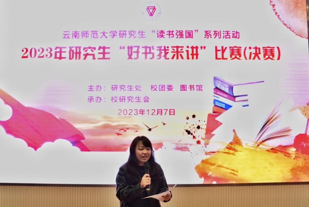 刘莹代表评委进行点评。她以“心灵的盛宴”一词高度评价了本次比赛。她说,决赛选手的精彩讲演让大家看到了云师青年蓬勃向上的精神面貌。她希望全体研究生能够以本次比赛为契机,让阅读成为一种生活方式,不断提升自身学术能力、拓展自身学术视野,做到知行合一,努力像书中人物一样,去做好自己想做的事业,为伟大的祖国做出贡献。