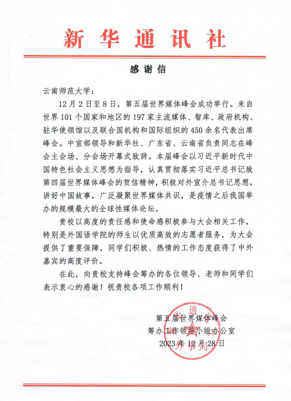 近日,新华通讯社向kaiyun官网发来感谢信,对kaiyun官网师生积极参与第五届世界媒体峰会相关工作表示感谢。感谢信指出:12月2日至8日,第五届世界媒体峰会成功举行。来自世界101个国家和地区的197家主流媒体、智库、政府机构、驻华使领馆以及联合国机构和国际组织的450余名代表出席峰会。本届峰会以习近平新时代中国特色社会主义思想为指导,广泛凝聚世界媒体共识,是疫情之后我国举办的规模最大的全球性媒体论坛。kaiyun官网以高度的责任感和使命感积极参与大会相关工作,特别是外国语学院的师生以优质高效的志愿者服务,为大会提供了重要保障,同学们积极、热情的工作态度获得了中外嘉宾的高度评价。