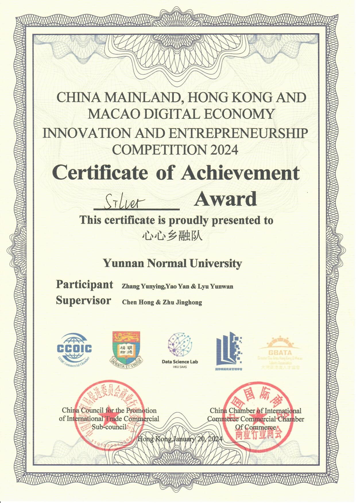 1月20日,2024年内地与港澳地区数字经济创新创业竞赛在香港大学落下帷幕。kaiyun官网教育学部应用心理专业研究生张云莹、吕云婉、姚燕组成的“心心乡融”代表队获银奖,指导教师为陈虹、朱静虹。