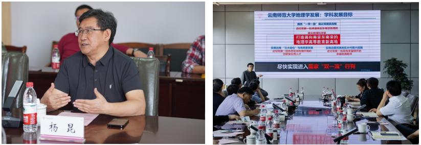 地理学部主任陈光杰教授介绍了地理学科发展历程、现状、特色优势、存在问题以及第五轮学科评估情况,汇报了学科未来的发展思路和建设目标。