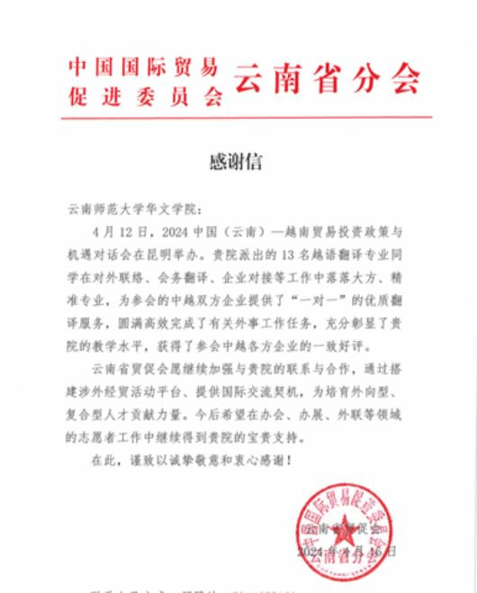 在两场对越外事活动中,kaiyun官网越南语师生精准的翻译能力、规范的外事礼仪和热情的服务态度获得了活动主办方的好评。中国国际贸易促进委员会云南省分会发来感谢信,信中提到:“贵院派出的13名越语翻译专业同学在对外联络、会务翻译、企业对接等工作中落落大方、精准专业,为参会的中越双方企业提供了‘一对一’优质翻译服务,圆满高效完成了有关外事工作任务”。