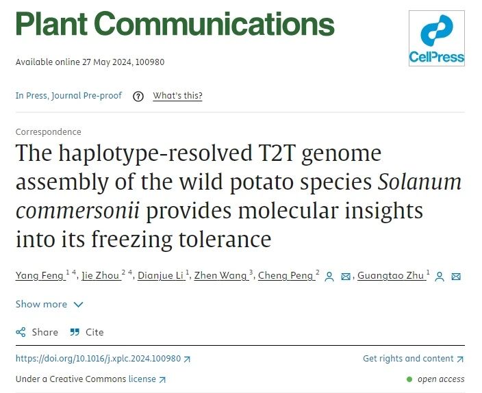 近日,由kaiyuncom官方网站祝光涛团队联合云南大学彭城团队在国际知名期刊《Plant Communications》(植物科学TOP期刊,IF=10.5)在线发表了题为“The haplotype-resolved T2T genome assembly of the wild potato species Solanum commersonii provides molecular insights into its freezing tolerance”的研究论文。该论文首次完成对杂合二倍体马铃薯两套单倍型端粒到端粒(T2T)基因组的构建,并揭示了此马铃薯种耐冻性的分子机制。