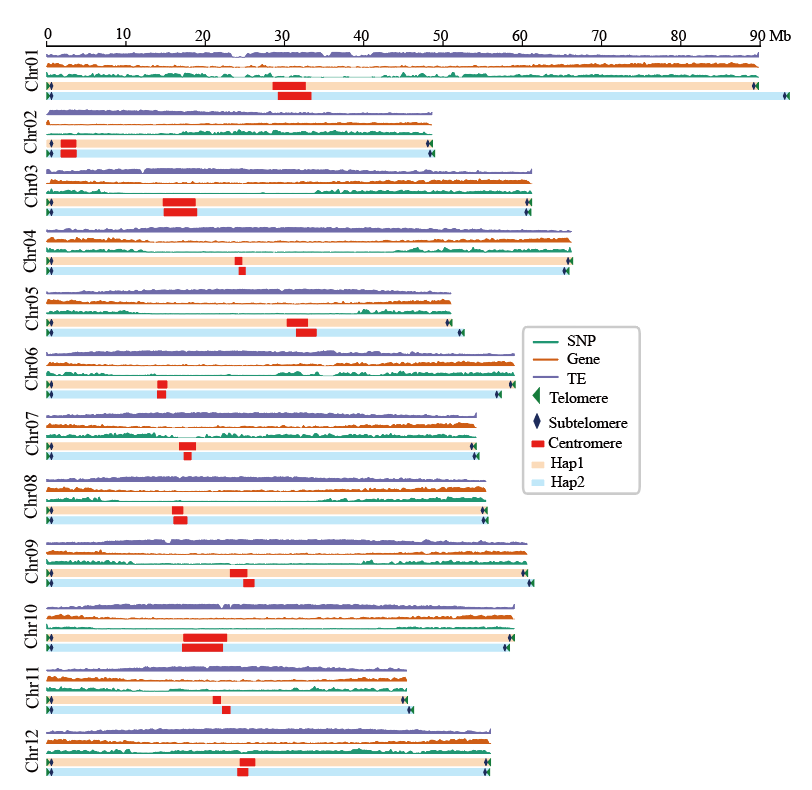 图1 两套单倍型中的端粒、亚端粒和着丝粒的分布及Hap1 中的 SNP、基因和转座子(TE)的分布
