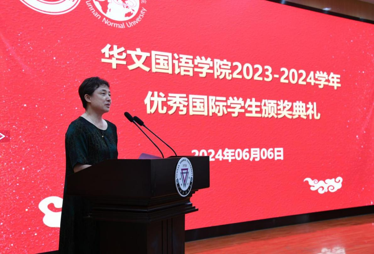 学院党委书记和雪莲宣读了《关于表彰2023-2024学年优秀国际学生、进步生、优秀班干部、文化交流之星、优秀班集体的决定》,她在讲话中希望国际学生志存高远,脚踏实地,勤奋学习,在青春奋斗中实现青春梦想,讲好中国故事,当好中外友好桥梁,为促进中外民心相通、文明互鉴,推动构建人类命运共同体贡献力量。