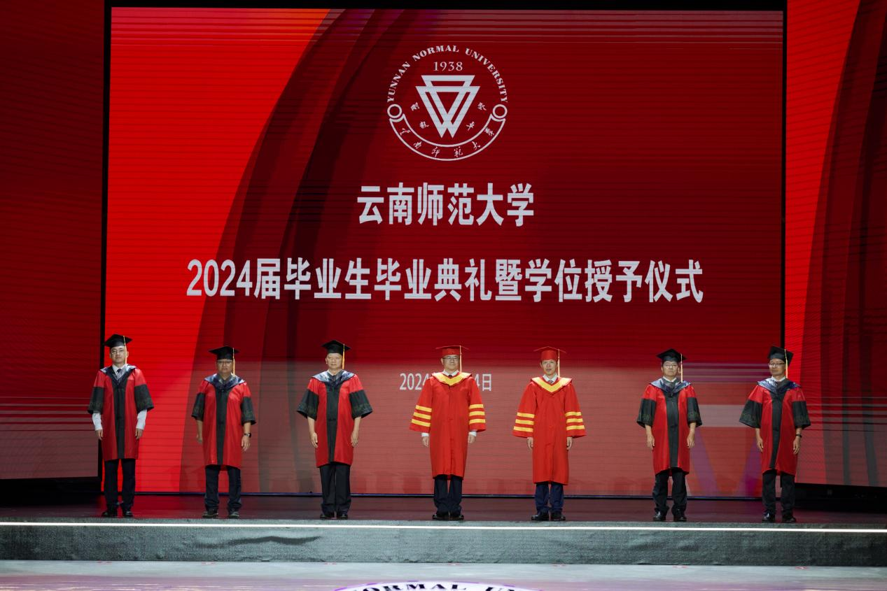 “学海无涯勤是岸,云程有路志为梯。”硕士毕业生代表杨愫深情回顾了在云师的七年时光,她积极参与实践活动,发挥法学专业特长,将法律带回家乡,多次到农村和学校参与普法宣讲。现在她将作为一名定向选调生回到家乡德宏,扎根基层,服务人民,在祖国边疆奉献青春之力。本科毕业生代表王柏超分享了他在云师四年的热血与汗水。作为国家一级篮球运动员,代表学校参加第16届云南省运动会等多个项目比赛并取得好成绩的他,光荣地成为了学校研究生支教团成员。他将把服务基础教育的初心带到祖国需要的地方去,帮助孩子们养成健康锻炼的习惯和优秀的体育品格。博士研究生代表邵文忠用严谨治学、艰辛喜悦、砥砺前行三个关键词回顾了自己在云师的求学经历。虽然科研之路充满挑战,但正是这些经历让他更加坚定梦想,继续勇攀科学高峰,倾心奉献学术事业。在校本科生代表赵思迪为毕业生们送上祝福,并表示以优秀的学长学姐为榜样,继续坚守初心、努力学习,握紧接力棒,传承西南联大精神,做有历史感责任感、志存高远的时代新人。
