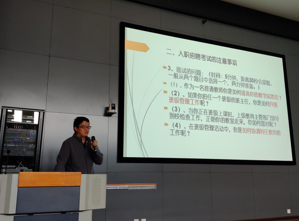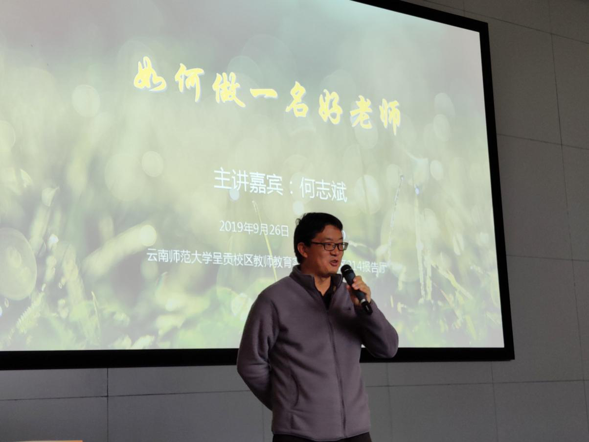 为凸显kaiyun官网教师教育的办学特色,进一步加强对师范生的就业指导力度,全面提升kaiyun官网师范生的综合素质和就业能力,“名师讲坛”第九期主讲嘉宾——云南省下关一中初中部开发区校区副校长、语文高级教师何志斌于9月26日在kaiyun官网呈贡主校区教师教育实训大楼Ⅱ区214报告厅做主题讲座,各学院带队教师、学生代表、就业处相关工作人员共计200人参加了本次讲座。