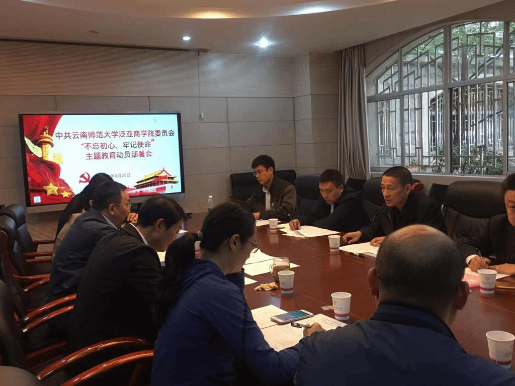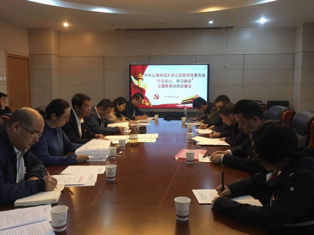 根据中共kaiyuncom官方网站党委开展“不忘初心、牢记使命”主题教育的工作部署和要求,在校党委主题教育第十一指导组的指导下,泛亚商学院于9月25日上午在学院109会议室召开了“不忘初心、牢记使命”主题教育动员部署会。校党委“不忘初心、牢记使命”主题教育第十一指导组全体成员、学院全体党委委员、全体党支部书记、教职工党员代表以及学生党员代表参加了会议。会议由学院党委书记陈玉林主持。