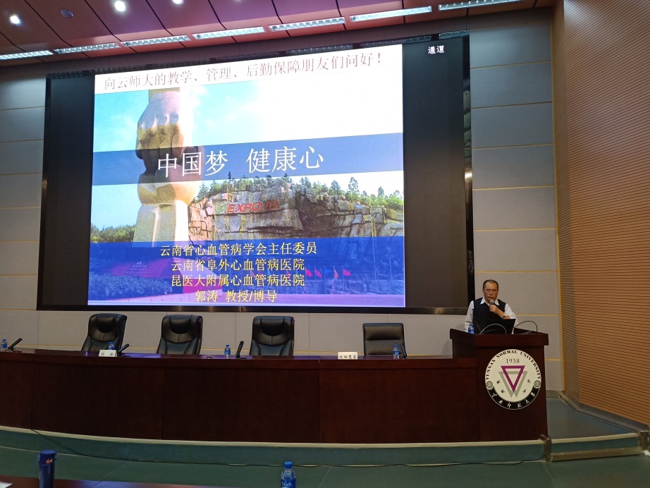 启动仪式结束后,校医院、校工会联合举办了教职工健康教育第一讲《心脑血管疾病的预防》,特别邀请到了云南省阜外心血管病医院国家一级主任医师、博导郭涛教授作为主讲嘉宾。郭涛教授以“中国梦•健康心”为题,用扎实的专业功底、深入浅出的讲解、幽默诙谐的语言,从健康的标准、心血管疾病的现状、心血管急症、与死神赛跑、心血管疾病的预防、科学锻炼等方面对心血管疾病进行了讲解,让到场的教职工对心血管疾病防治有了更深的认识。讲座结束后,郭主任为现场的教师进行了疾病相关咨询。活动现场,云南省阜外心血管病医院的专家团队为教职工进行了心肺复苏急救培训、义诊、健康咨询活动。
