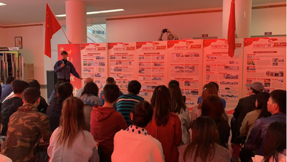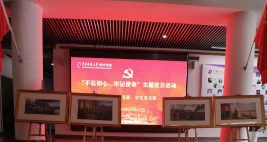 十月的校园,红色映金秋。10月10日下午,美术学院教职工党支部与学生党支部党员在学院一楼党员教育活动区,共同举行“不忘初心、牢记使命”主题党日活动。红色的国旗、红色的党史展板整齐排列,红色LED屏将整个大厅映衬得喜庆而热烈。师生党员共50余人参加了活动,活动由教职工党支部书记李雪岳老师主持。