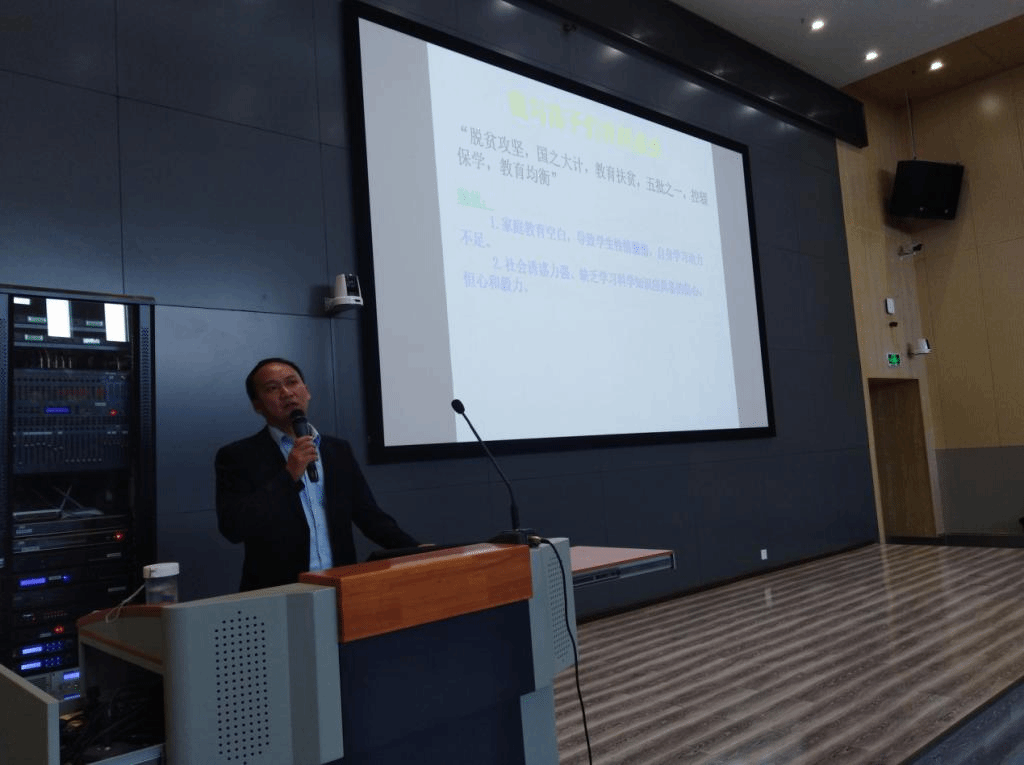 周加超校长以“我和我的孩子们”为主题,从展示坝心乡中心学校所在位置、校园面貌和教学条件开始,通过分享自己多年的从教经历和内心感受,告诉在场同学:“学校虽小,但却是成就我的大舞台。”接着,结合kaiyuncom官方网站近几年对外发布的毕业生就业数据,从毕业生的就业流向、教师工资水平及福利待遇、社会认可度等维度分析教师行业总体情况和未来发展前景,旨在引导同学们对教育行业的职业认同感和未来就业的信心。最后,围绕“我与孩子们共同成长”这条主线,结合中小学教育现状和自己在乡镇学校所经历的典型案例,从“控辍保学”这个角度向在场同学们诠释什么样的教育才是让教师愉快的施教,让学生健康快乐的成长。