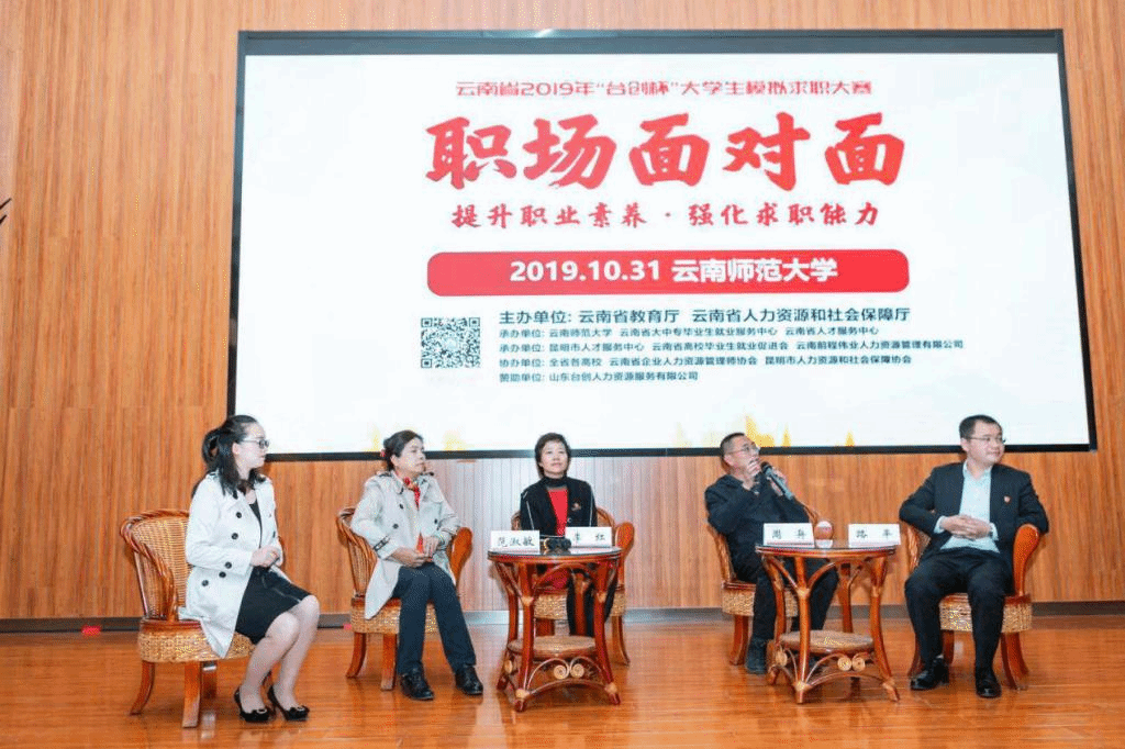 2019年10月31日下午,云南省2019年“台创杯”大学生模拟求职大赛系列活动之“职场面对面”在我校呈贡校区汇学2栋101报告厅举行。该活动是云南省教育厅和云南省人力资源和社会保障厅主办的“云南省2019年‘台创杯’大学生模拟求职大赛”的重要组成部分,由主委会组织省级就业主管部门领导、高校就业指导老师、企业人力资源专家到校围绕职业常识、就业准备、择业技巧等方面开展面对面指导和交流活动。