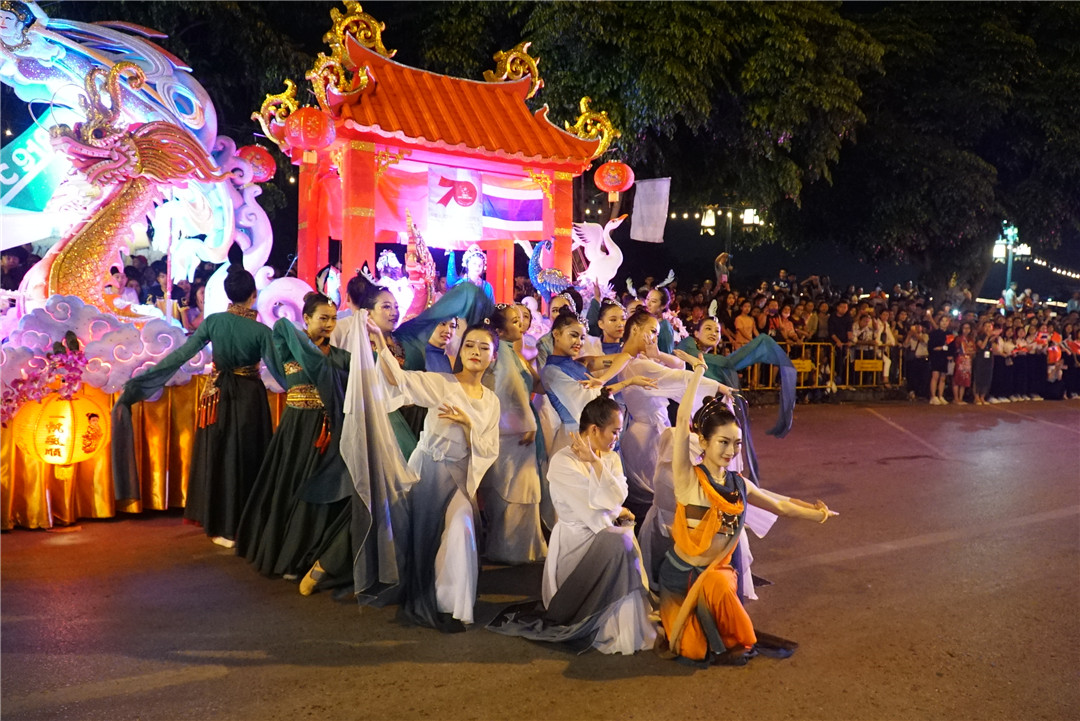 整个游行队伍从清迈塔佩门出发,途经2个多小时抵达清迈市政府广场。一路上大家都争着与花车和孔院“中国风”巡演团合照,并不断地能听到中文的欢呼以及外国人大喊CHINA,感受到了汉语“你好”的温暖与朝气,为身在异国他乡的同胞送去了一股股暖流。很多中国游客看到中国的花车,不禁轻声唱起“我和我的祖国,一刻也不能分割……”,激动和喜悦之情溢于言表。在清迈市政府广场上,孔院的“中国风”巡演团为大家带来了精彩的中国风群舞《丝路印象》,以丝路印象舞蹈结合了中国古典舞的汉唐水袖、敦煌舞等不同的表现形式,展现出中国文化的丰富多彩及深厚的底蕴。整只舞蹈以敦煌舞开场、串场,呈现了一带一路上敦煌壁画的辉煌景象,好似壁画“飞天”从壁画中走出,带来了新海上丝绸之路“一带一路”发展的新气象;身着黑白水墨飘纱的少女翩翩起舞,将中国水墨书画的飘逸与洒脱展现得淋漓尽致。而源自大唐盛世舞姿的汉唐水袖则呈现出了中国的日益强盛以及对中泰一家亲更亲的美好祝福。整个舞蹈表达了对泰国传统节日——水灯节的美好祝愿,同时祝福中泰友谊更上一层楼,舞蹈演员精彩的演绎赢得了在场观众热情的欢呼声和阵阵掌声。