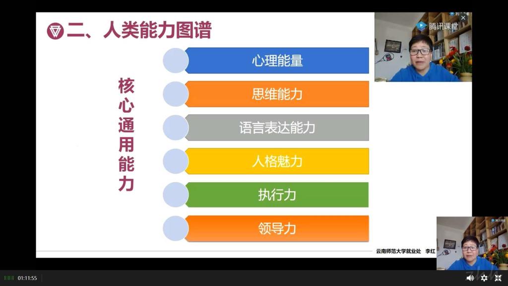 讲座中,李老师强调个人能力的培养。提到“人类能力图谱”,包括:学科知识能力、核心通用能力、职业能力。她还提出了“三业探索”:学业是职业和事业的基础,职业是学业和事业的桥梁,事业是学业和职业的目标。不论是学业、职业还是事业,大学生所要做的就是明确自身定位,充满激情的去学习,补足短板,让自己做一个高素质人才。