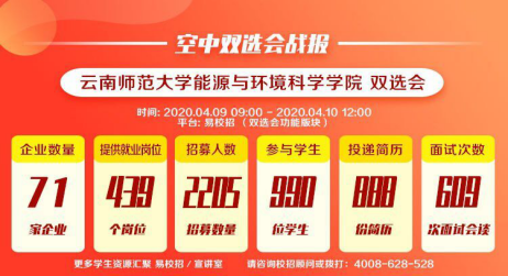 为进一步贯彻落实党中央、国务院关于促进高校毕业生就业工作的决策部署,减少疫情对毕业生就业工作的影响,能源与环境科学学院积极响应学校就业处关于做好疫情期间就业帮扶工作安排,于2020年4月9日举办了2020届毕业生网上招聘双选会,为毕业生和用人单位搭建交流双选平台。
