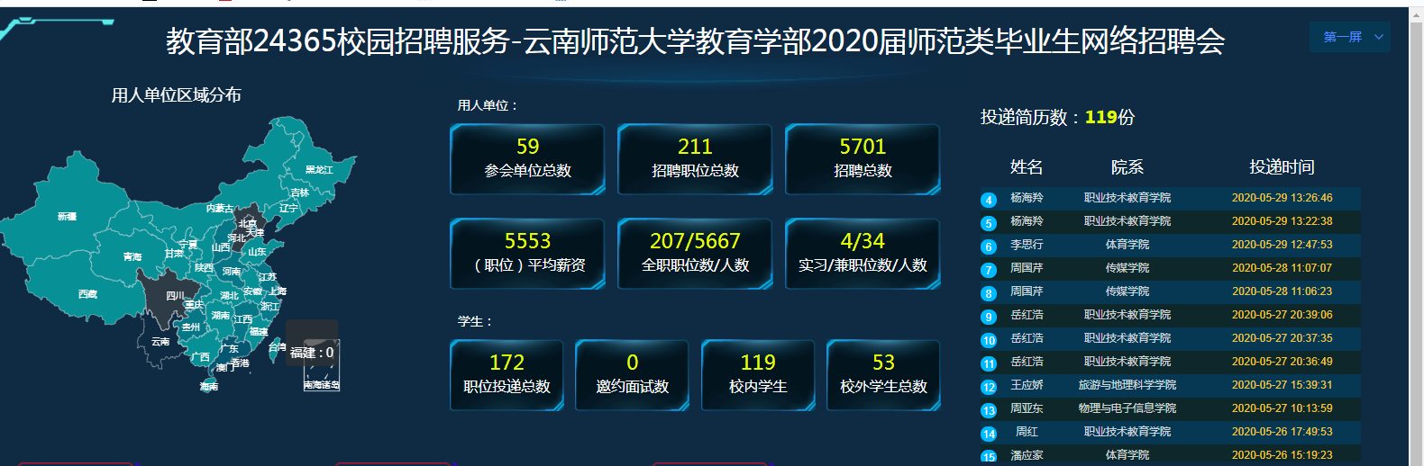 本次招聘会的招聘职位211个,毕业生投递简历份119份,招聘专业除了包括教育学部师范类专业,还涵盖了职业教育技术学院、文学院、化工学院、物电学院、文学院等17个学院的不同专业。从参会人数、毕业生反馈、简历投递情况看,同学们对此次线上招聘会的参与度、认可度较高。