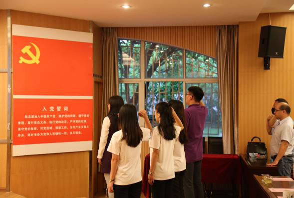 随后,在研究生第一党支部书记李丽同志领誓下,刘江峰、张亚芳、杜佳佳、候文邈4名新预备党员进行了入党宣誓仪式,其他全体党员重温入党誓词。