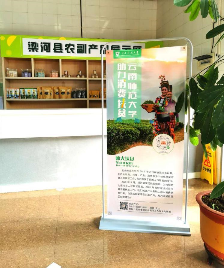 为持续助力梁河县人民脱贫致富,8月31日,后勤保障服务中心在呈贡主校区教工餐厅设立了梁河县特色农副产品展示区,让师生可以零距离了解、自愿购买梁河县农副产品,加入到消费扶贫的行动中来。师生可以通过微信扫码直接购买由梁河县人民政府推荐的扶贫企业——梁河边城食品有限公司提供的梁河县特色农副产品。