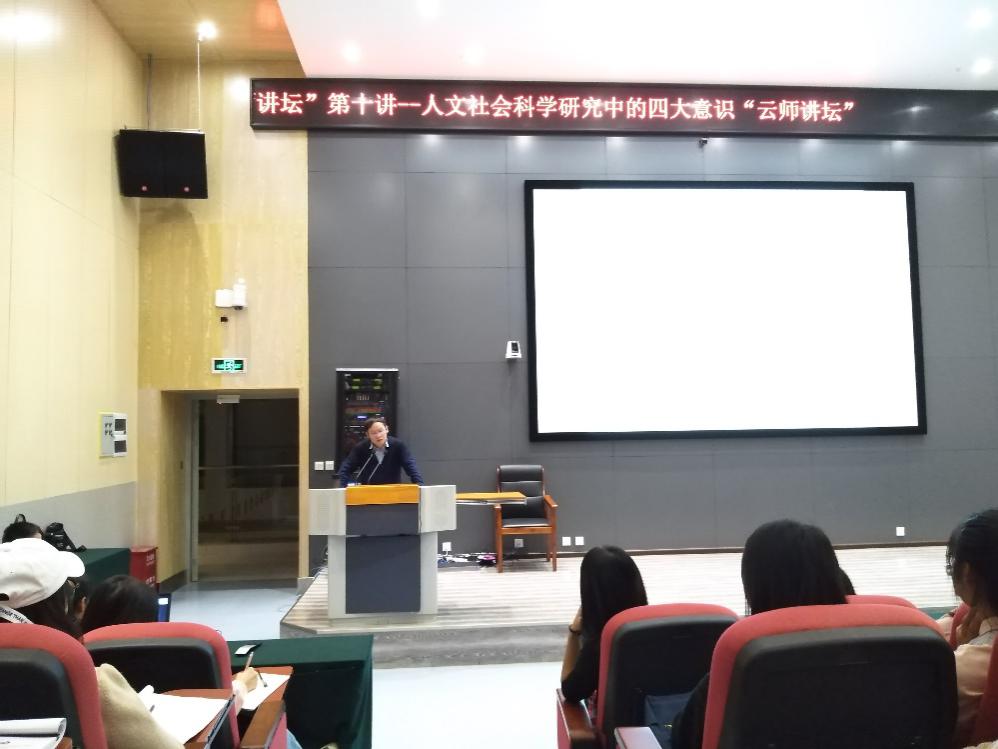 10月9日晚,云师讲坛第十讲邀请到kaiyuncom官方网站文学院副院长--傅宇斌教授担任主讲嘉宾。讲座在kaiyuncom官方网站呈贡校区国家级实验教学示范中心214报告厅举行,傅教授为师生带来了“人文社会科学研究中的四大意识”为主题的讲座。讲座由科学技术处副处长刘连杰教授主持。科学技术处、网络与信息中心等职能部门负责人,以及在校本科生、研究生等230余名师生代表一起现场聆听了讲座,讲座还在线上开通了同步直播。