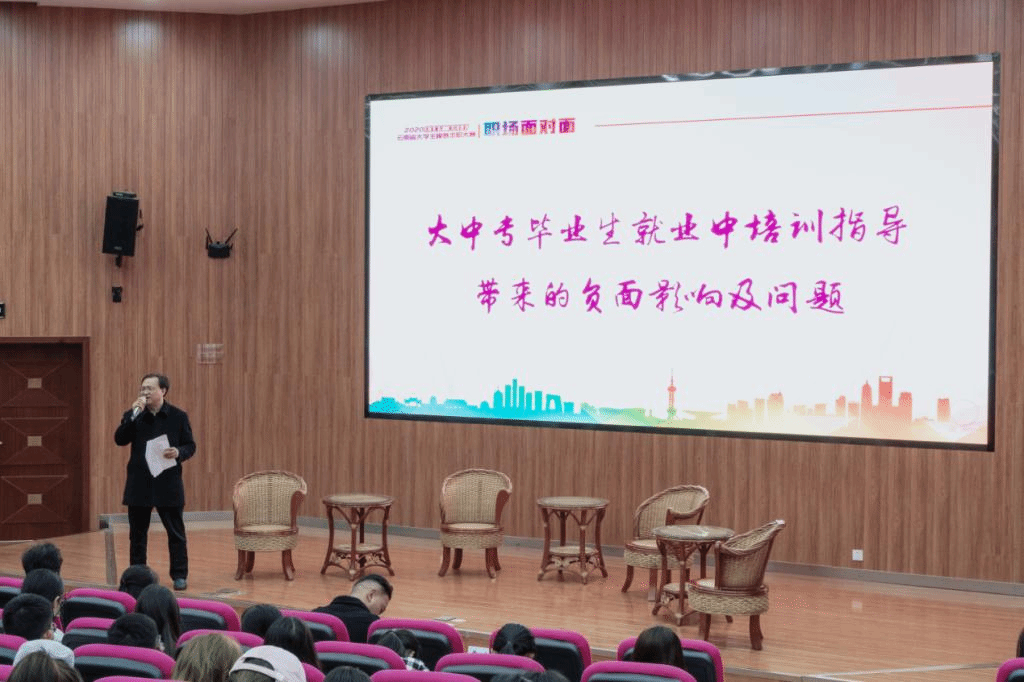 昆明市人才服务中心教育分中心副主任罗静波结合工作案例,从大学生参加各种培训中遇到的问题和带来的负面影响,引导同学如何正确面对各类培训和就业指导,并从中形成正确的判断。