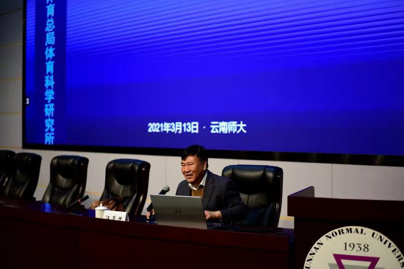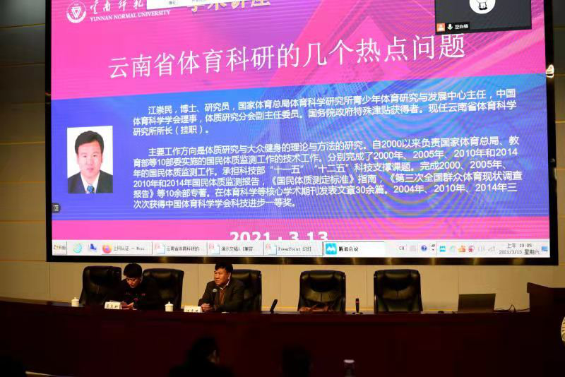 3月13日上午,云南省体育科研研究所所长江崇民博士应邀到kaiyun官网西边中心报告厅作“云南省体育科研的几个热点问题”的专题讲座。此次讲座采用了线上线下相结合的方式,讲座由体育学院院长聂真新教授主持,体育学院部分教师与学生参加。