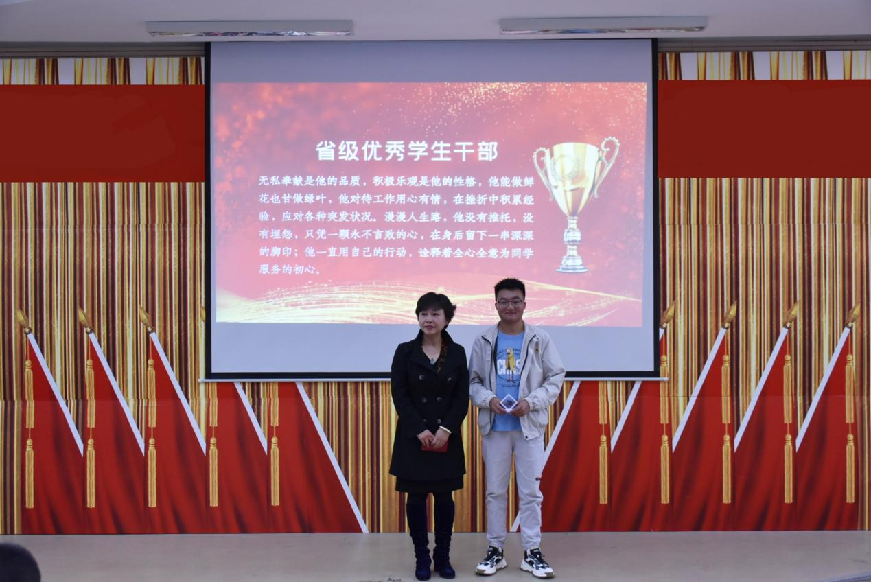 颁奖典礼采取各奖项视频展示、现场颁奖相结合的方式,表彰了国家奖学金、国家励志奖学金、省政府奖学金、省政府励志奖学金、省级三好学生、省级优秀学生干部、创新创业之星、团学活动风采之星、志愿服务风采之星、年度奉献之星、年度励志之星等11个个人奖项和最佳体育团队、校级优秀班级体、省级先进班级体、最佳学生组织等4个集体奖项。出席领导、老师分别向获奖的先进集体、先进个人宣读《颁奖词》、颁发奖杯和纪念徽章。