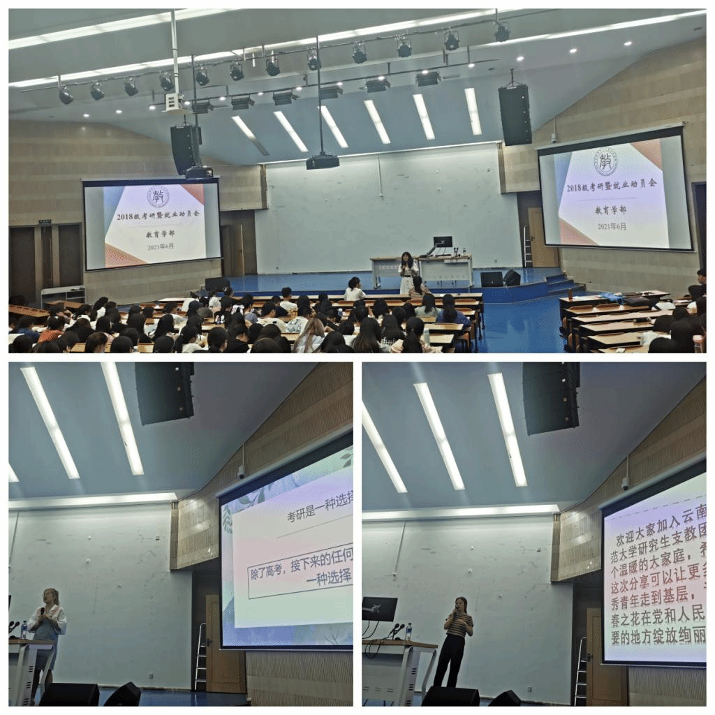 随后,3位2017级考取研究生的同学进行了考研分享。特殊教育班邹梦迪分享保送华东师范大学的经验,应用心理学B班刘瑞分享入选研究生支教团的经历,应用心理学B班金亚婷分享自己的择校经验,以朋辈辅导的方式为学弟学妹们提供了帮助。