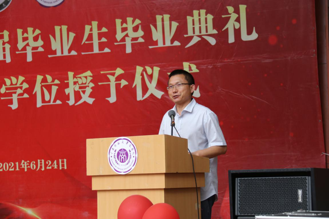 文学院党委书记毛志荣发表讲话,悉心叮嘱毕业生要心怀梦想,朝着梦想努力;要拒绝“躺平”,要在大有作为的时代,明大势、谋大事,矢志追求更有高度、更有境界的人生。