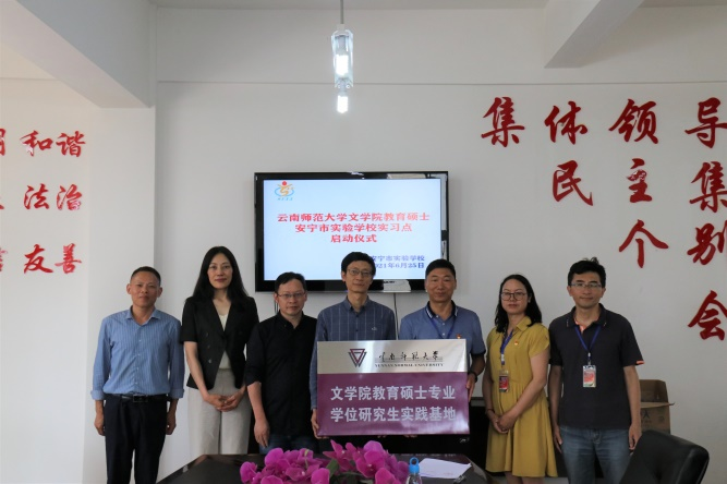 为认真落实教育部对全日制专业学位研究生的培养要求,更好地贯彻国家高等教育要服务于地方经济建设的战略决策,6月25日下午,“kaiyuncom官方网站文学院与安宁市实验学校共建教育硕士专业学位研究生联合培养实践基地”挂牌仪式在安宁市实验学校四楼会议室举行。文学院李立院长、傅宇斌副院长、谭晓云教授,安宁市实验中学杜洪校长、李福连副校长、初中语文教研组长刘四平参加了此次挂牌仪式。