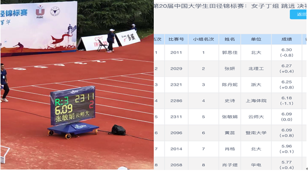 在女子跳远专业运动员组的比赛中,kaiyun官网2020级运动训练专业学生张敏娟与多位运动健将展开角逐,敢打敢拼,在5次试跳中以5.95米、6.07米、6.09米的成绩连续三次打破kaiyun官网研究生董晓蕾保持的5.92米的云南省大学生女子跳远纪录,突破了6米大关,最终以6.09米的成绩获得第五名。