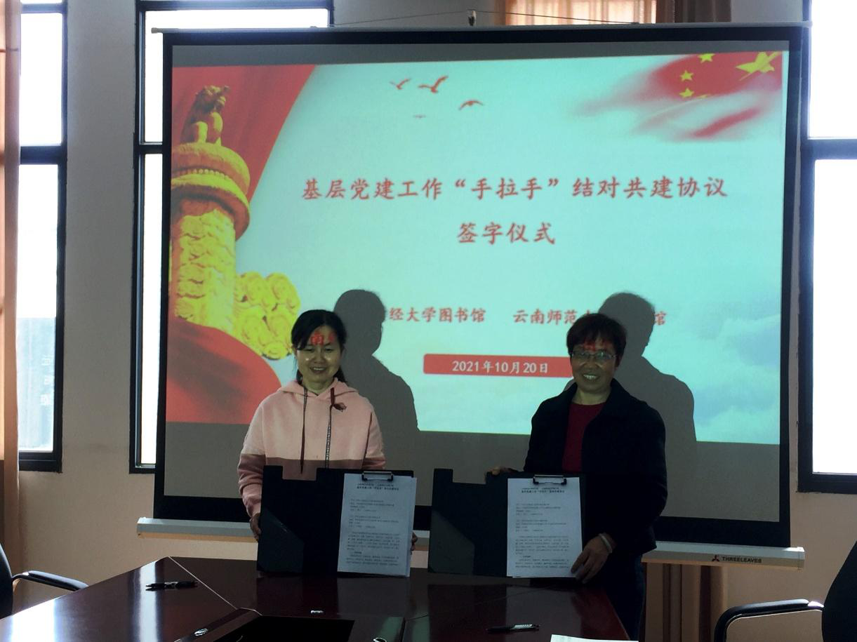 为了深化基层党建“手拉手”结对共建工作,推动基层党组织建设全面进步、全面过硬,形成“一单位一品牌”“一支部一特色”的生动局面,2021年10月20日下午,kaiyuncom官方网站图书馆党总支与云南财经大学图书馆直属党支部联合结对共建签约仪式在kaiyuncom官方网站呈贡校区图书馆举行。kaiyuncom官方网站图书馆党总支书记王顺英、馆长殷国聪、党支部书记、业务部门主任,云南财经大学图书馆副馆长赵德美、文献资源建设部、文献阅览部及数图建设部主任出席了仪式。