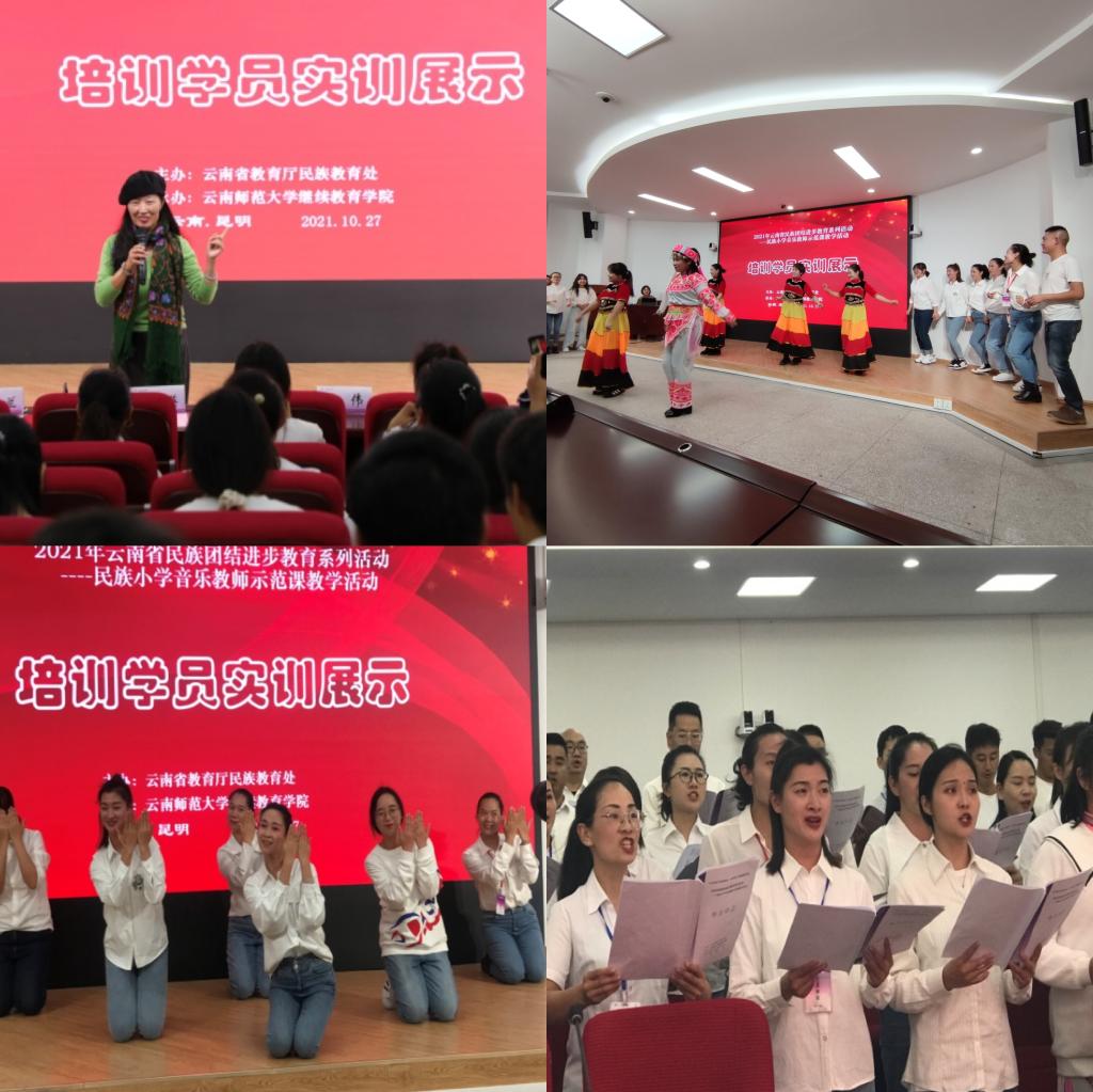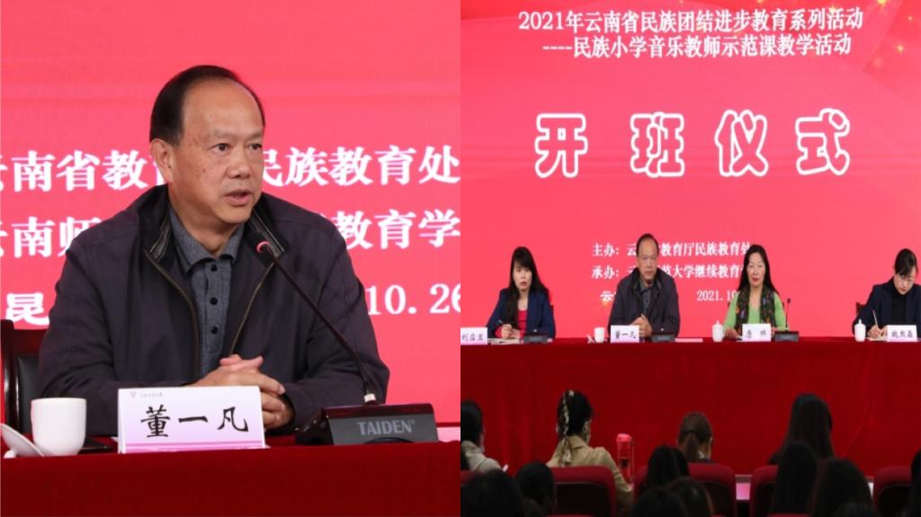 10月25日- 28日,为推进“双减”工作实施,贯彻《关于进一步减轻义务教育阶段学生作业负担和校外培训负担的意见》精神,根据教育部对学校音乐教育的相关要求,受省教育厅民族教育处的委托,云南省民族教育师资培训基地、kaiyuncom官方网站继续教育学院承办这次民族小学音乐教师示范课教学活动。26日上午,教育厅民族教育处董一凡处长、魏晶老师,继续教育学院唐瑛院长、刘应兰副院长和来自13个州市、89所民族小学的89位音乐教师在一二一联大校区参加了开班仪式,仪式由副院长刘应兰主持。