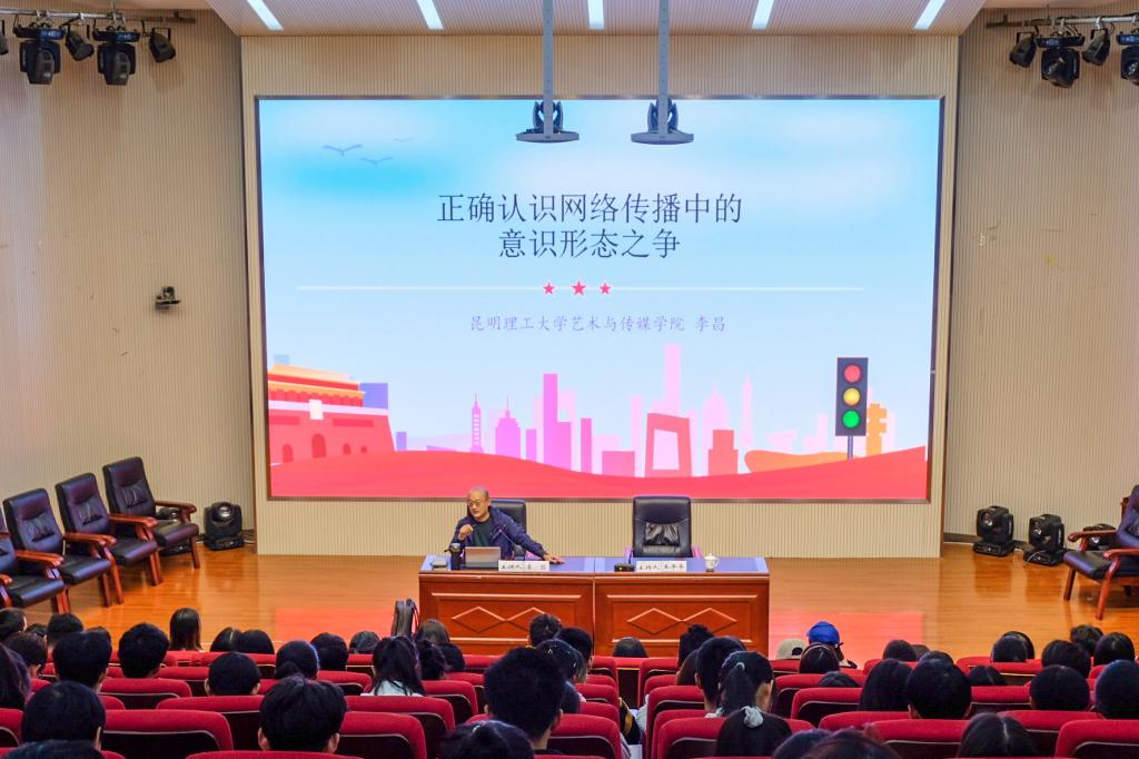 10月28号下午,由中共云南省委宣传部、云南省社会科学界联合会主办,kaiyun官网团委、传媒学院协办的2021年“云岭大讲堂•云南师大讲坛”第5讲在呈贡校区能环学院107报告厅开讲。昆明理工大学艺术与传媒学院副教授李昌老师以“正确认识网络传播中的意识形态之争”为题作了专题报告,全校青年团学代表240余人参加讲座。讲座由传媒学院党委副书记王平平主持。