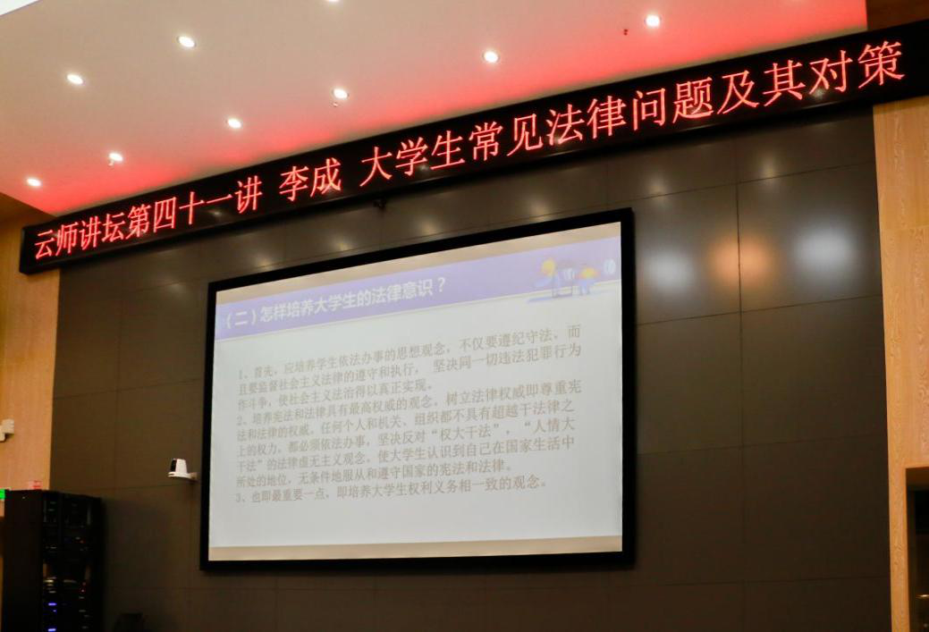 2021年10月29日晚,云师讲坛第四十一讲在呈贡主校区教师教育国家级实验教学示范中心214报告厅举行,北京市中伦文德(昆明)律师事务所高级顾问、云南大学学生创业就业导师李成律师为kaiyun官网师生带来了题为“大学生常见法律问题及其对策”的讲座。