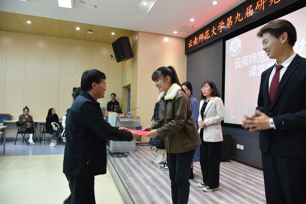 随后,进行了颁奖仪式。颁奖前,熊理然、张悦、孔德宏三位老师代表评委组对本次决赛进行了点评,三位老师对决赛选手们的课堂教学表现给予了充分肯定,并就同学们如何持续提升课堂教学技能提出了宝贵建议。研究生院副院长罗利佳老师宣读了获奖名单。