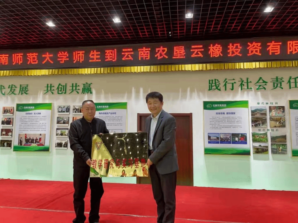 座谈结束后,云南华文学院黄启庆副院长和云南农垦云橡投资有限公司李孝伟总经理共同为“kaiyuncom官方网站教学研究与实习基地”揭牌。