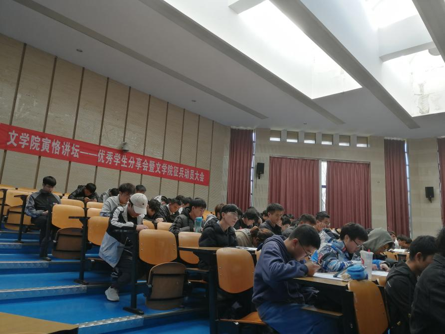 为了让学生了解应征入伍的相关事项,鼓励学生把爱国之心化为报国之行,把热血挥洒在实现强军梦的伟大实践之中,文学院于12月24日在汇文2区报告厅举办了第三期“寅恪讲坛”文学院优秀学子分享会暨征兵动员大会。会议邀请了文学院3位优秀退伍大学生为有意参军的同学进行分享。