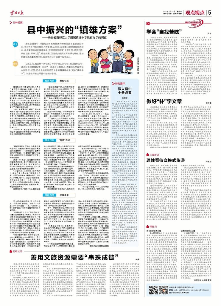 “本地生源留不住,优秀教师招不来,刚开始那会儿,我也很困惑。”谈及曾经的“创业历程”,镇雄中学党委书记、校长胡克州不无辛酸,“但这就是云南薄弱地区的县中存在的共性问题。”“县中教育面对的主要矛盾,是人民群众对优质教育资源的需求和不平衡不充分的教育质量发展之间的矛盾,这也让我们充分认识到,办一所好学校,要形成科学的办学思想,体系化提升教育质量。”