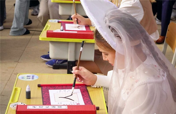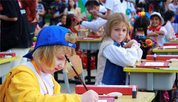 开营仪式上,58名小朋友参加了富有中华传统文化特色的开笔礼。他们身穿各自国家的传统服饰,跟着示范者整理衣冠,行见面礼;一撇一捺,用毛笔在描红纸上写下顶天立地的“人”字。之后,他们的额头被点上朱砂,意味开蒙启智,希望他们奋发学习,坚持不懈追逐中文梦想。