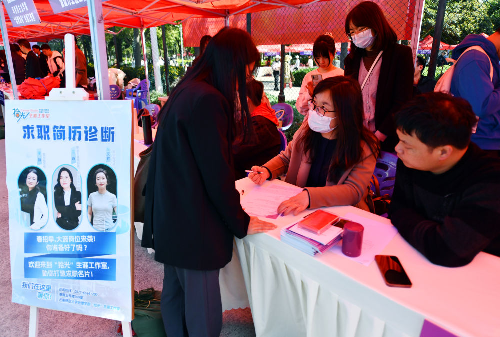 3月23日,老师在招聘会现场为学生进行简历优化指导。新华社记者王静颐 摄